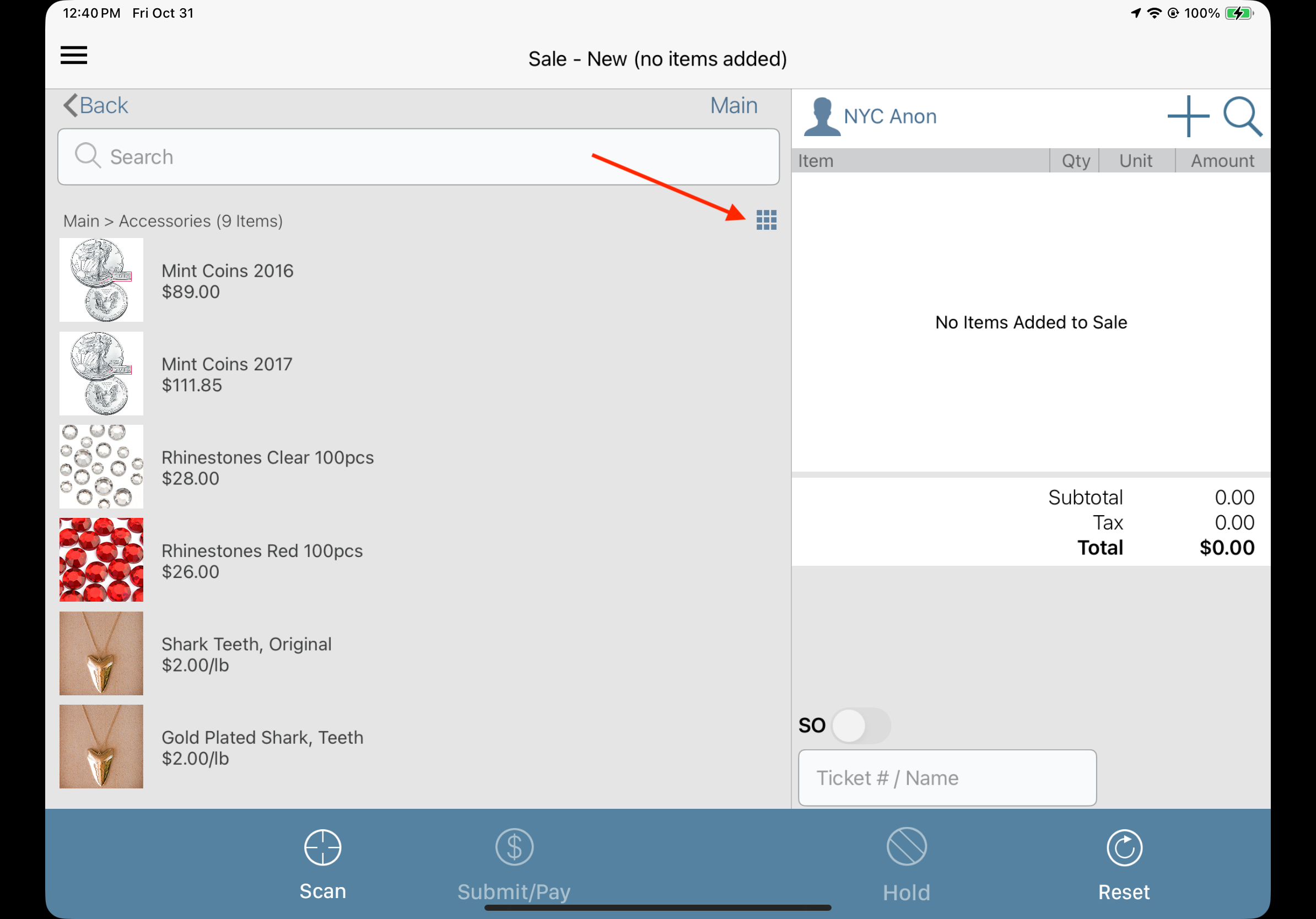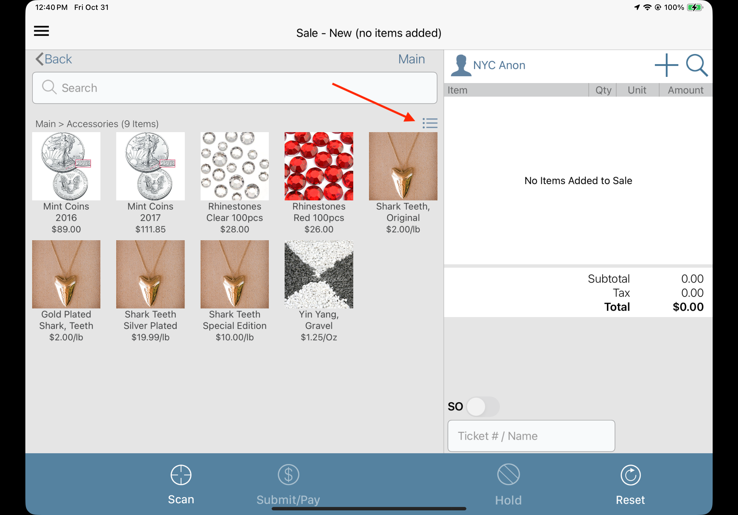 SuitePOS items can now be viewed either in tiled view or list view. To switch the views (which remains sticky) you toggle the button below. This is very useful when you have long texts, common in wine and spirits or jewelry; or want to display items according to your needs.